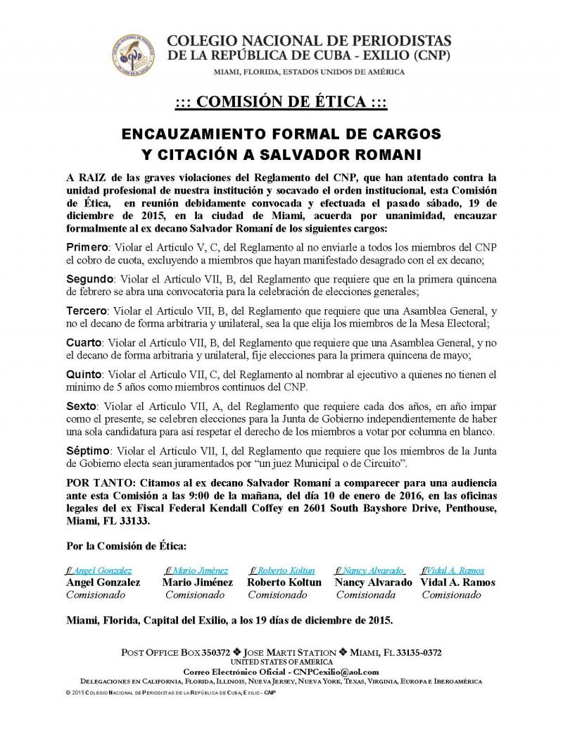 MIAMI, Florida [MARTES, 07.15.2015] Un Comité de Emergencia del Colegio Nacional de Periodistas de la República de Cuba – Exilio (CNP), ha publicado una “Declaración Oficial” enumerando graves violaciones al Reglamento del CNP cometidas por el ex decano Salvador Romaní y señalando la necesidad urgente de la elección de un nuevo decano y una nueva Junta de Gobierno. Esta elección debió celebrarse en el pasado mes de mayo, pero Romaní la canceló arbitrariamente con miras a perpetuarse en el cargo de forma ilegal.