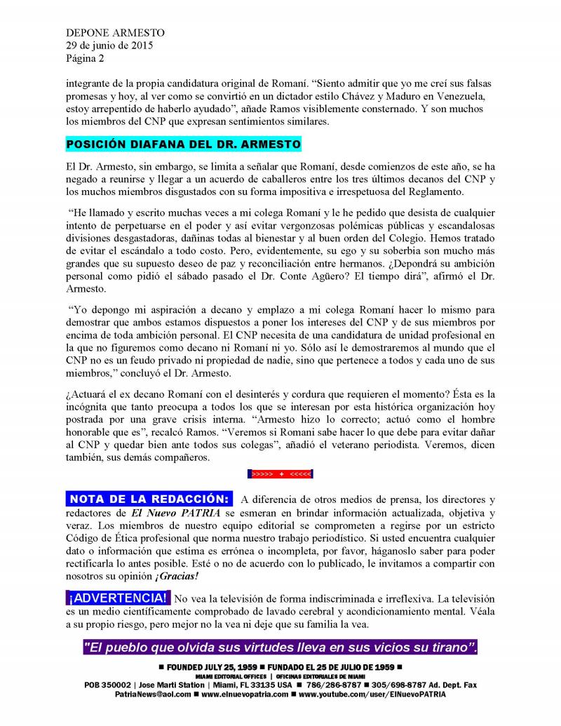 Al preguntársele si Romaní sabe que tendrá que responder ante los miembros del CNP y el exilio cubano por todo de lo que se le acusa, Armesto dijo con la sonrisa que lo caracteriza: “Esa pregunta le corresponde al amigo Romaní, no a mí. Claro está, si él solicita mi ayuda para cumplir con todo lo que se le ha olvidado cumplir, como buen colega, jamás se la negaré”.