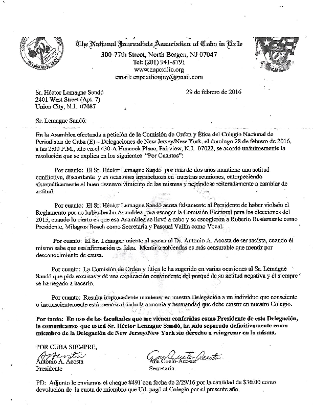 Aparte de dictador, chismoso y racista, eres cobarde. Eres cobarde porque no tuviste el valor de leer el ilegal decreto firmado por ti y tu esposa tratando de expulsarme del CNP sin motivo justificado, y mucho menos mi respuesta. (Adjunto ambos documentos)