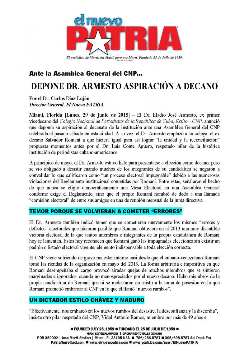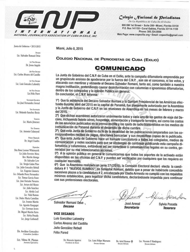 MIAMI, Florida [MARTES, 07.15.2015] Un Comité de Emergencia del Colegio Nacional de Periodistas de la República de Cuba – Exilio (CNP), ha publicado una “Declaración Oficial” enumerando graves violaciones al Reglamento del CNP cometidas por el ex decano Salvador Romaní y señalando la necesidad urgente de la elección de un nuevo decano y una nueva Junta de Gobierno. Esta elección debió celebrarse en el pasado mes de mayo, pero Romaní la canceló arbitrariamente con miras a perpetuarse en el cargo de forma ilegal.