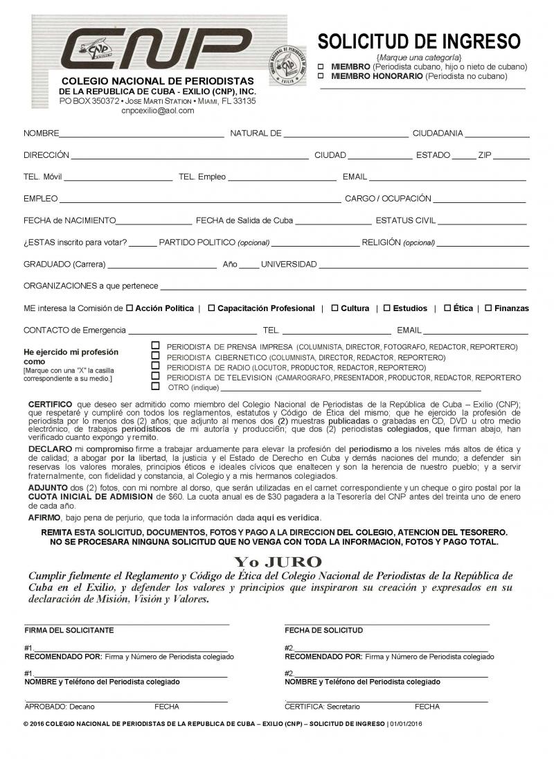 Por favor, llena esta Solicitud de Ingreso y enviala con la documentacion necesaria y tu cheque o giro postal al CNP, POB 350372, Miami, FL 33135