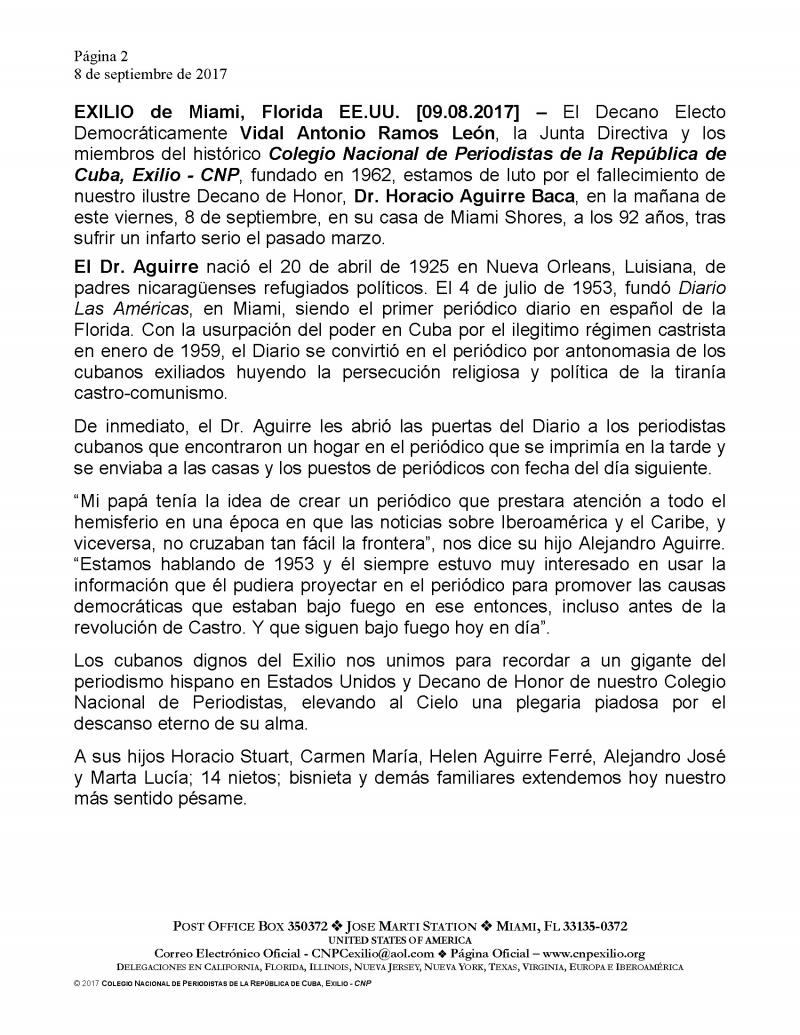 Invitamos a todos los miembros del CNP y a nuestra comunidad a acompañar a la familia Aguirre, al Decano Vidal Antonio Ramos y a demás miembros de la Junta Directiva en darle el ultimo adiós a nuestro querido amigo y colega Horacio Aguirre Baca.